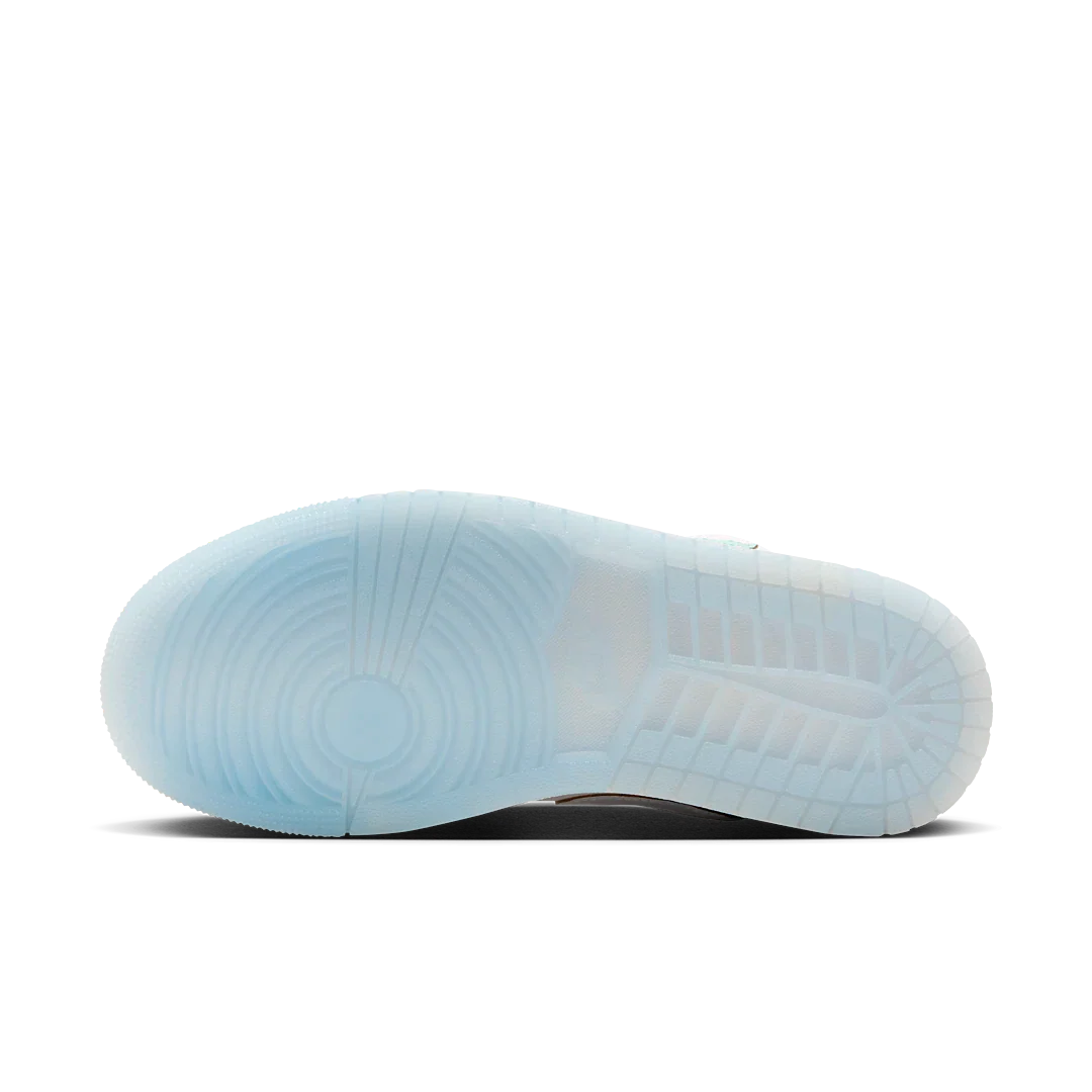 The Women's Jordan 1 Low-Top Special Edition in Emerald Rise features an upper of smooth leather in white with ice-blue tumbled leather overlays at the toe and midfoot. The tumbled leather overlays on the eyestays and heel are in gradient shades of sky blue to pale green. The side-panel Nike Swoosh is formed of ice-blue tumbled leather toward the heel and pale green tumbled leather at the midfoot. The white mesh tongue sports a white tag with a tonal Jumpman, while the white mesh insole features the letters ER. The white foam midsole contains air for cushioning, while the translucent ice blue outsole is grooved to absorb impact and provide traction.