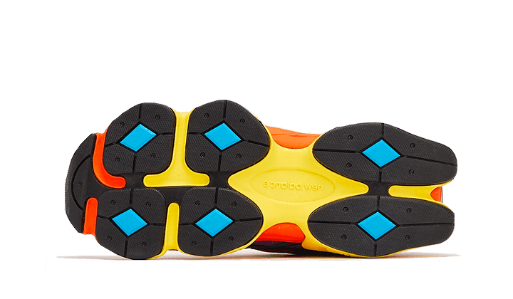 This 9060 New Balance model has a body that is composed of a variety of mesh and plastic materials. There are multiple bright colors featured, including purple, orange, yellow, and blue. There are also a few light touches of Pastel Green that can be seen on the heel. On top of the body, there are bright orange shoelaces, as well as a New Balance logo in the same orange on the tongue.