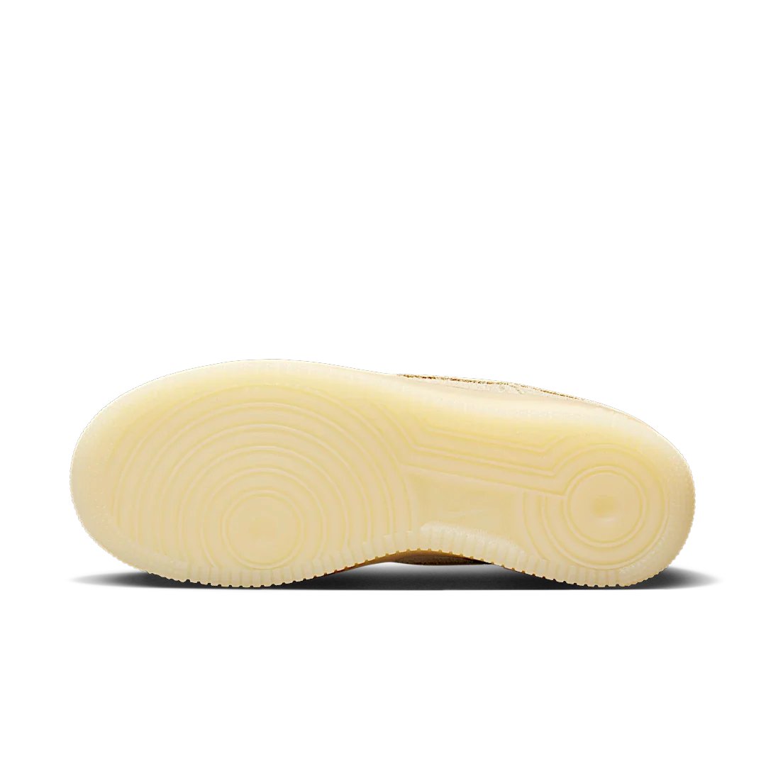 The Women's Grain and Royal Blue Nike Air Force 1 Low-Top sports an upper composed almost entirely of grain-colored suede, including stitched overlays. The signature perforations for breathability dot the toebox, along with the side panel just above the mudguard. The padded collar offers a sleek design and ankle comfort, while the tonal laces provide a secure closure and feature a matching lace dubrae with AF1 branding. The foam midsole in gradient shades of grain encapsulates Air for ultimate cushioning, and the glossy off-white translucent rubber outsole maintains the colorway as it provides grip.